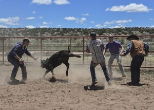 Airmen recently had the opportunity to visit the 4 Daughters Ranch and try their skills as ranch hands.The ranch, owned and operated by Mike Mechenbier, the 58th Special Operations Wing’s honorary commander, gave the Airmen the opportunity to administer shots, clip ears, and brand three-month-old